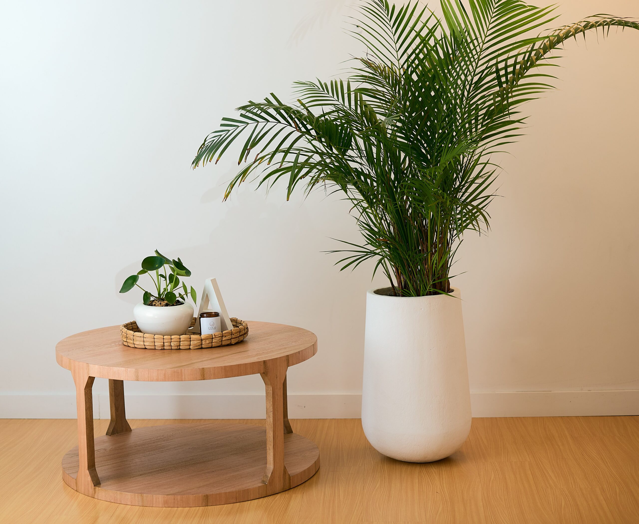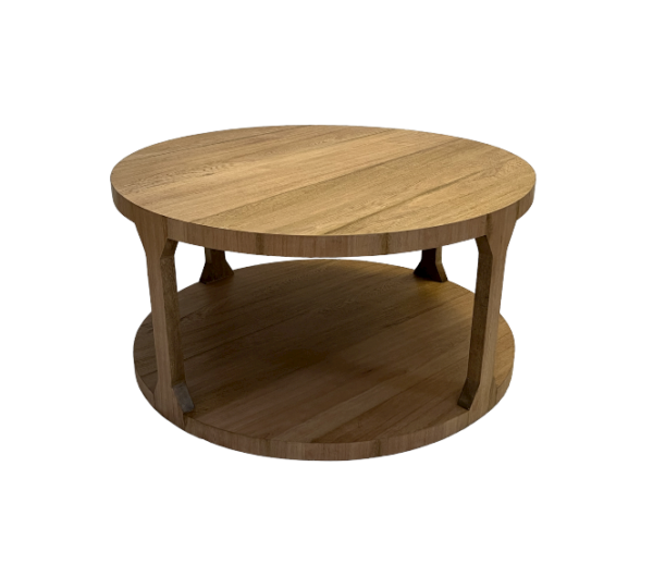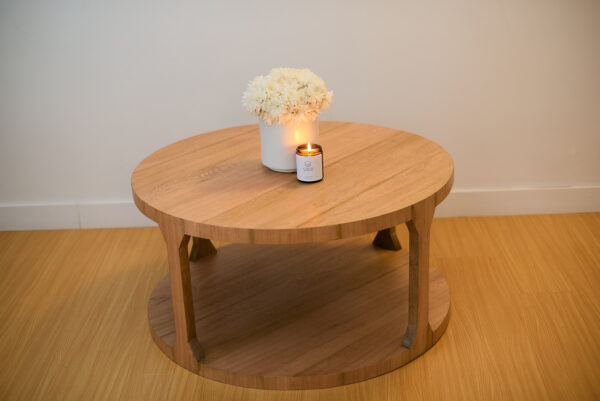 Mesa de centro circular, en madera de Roble, con pintura en acabado natural y poro semi abierto.